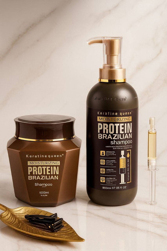 پک حرفهای کراتین کویین ✨ 🇬🇧 اصل انگلستان – هولوگرام دار 🔹 شامپو 800ml + ماسک مو 1000ml 🔹 حاوی پروتئین برزیلی، روغن آرگان، کلاژن، کراتین و ویتامینهای B3 , B5 , B6 🔹 بدون سولفات، سیلیکون، نمکهای معدنی و پارابن 💆♀️ مناسب انواع مو (خشک، آسیبدیده، رنگ و کراتین شده